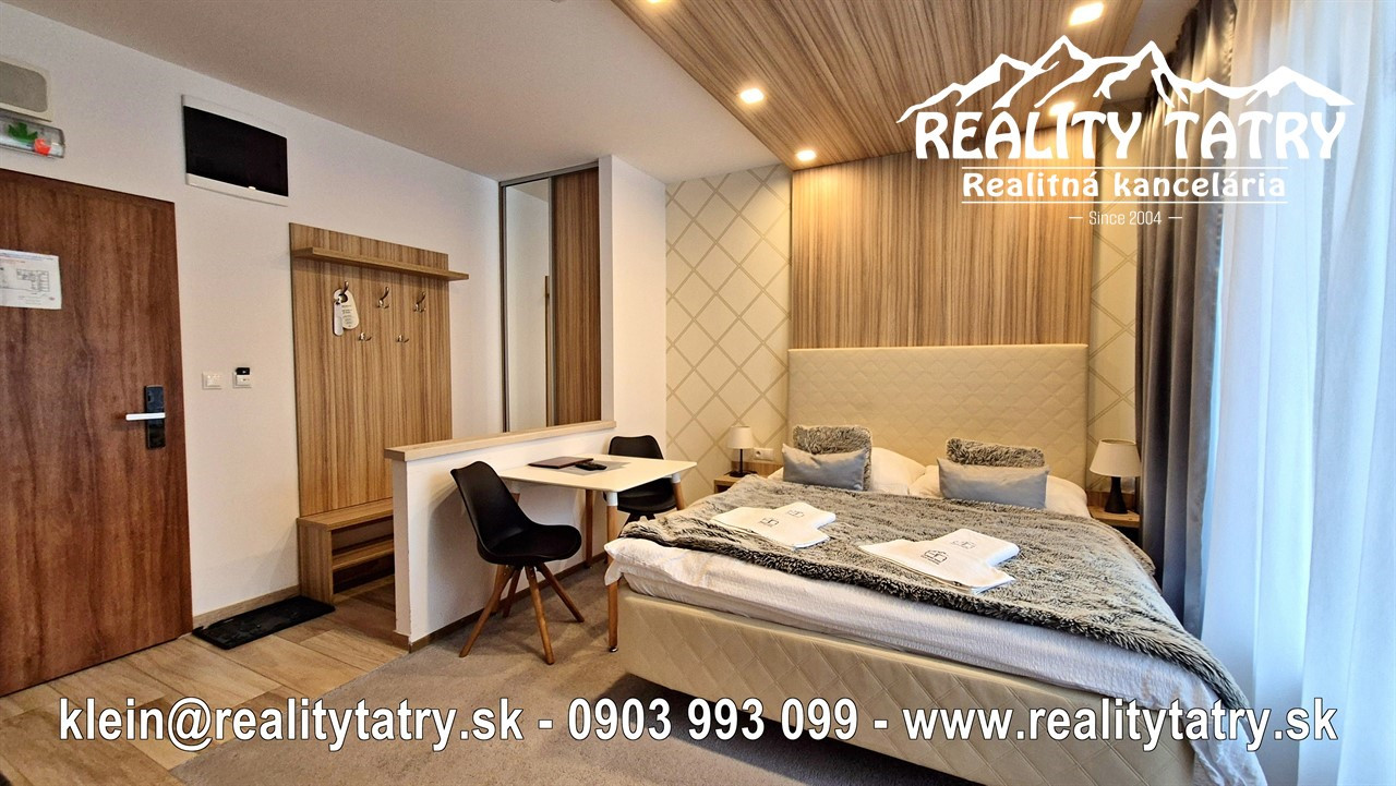 Exkluzívne vám ponúkame na predaj apartmán s terasou priamo v srdci Vysokých tatier - Starý Smokovec. Veľkosť apartmánu je 23 m2 + 6 m2 terasa. Apartmán sa nachádza v unikátnom komplexe HREBIENOK Rezort I. Komfortné bývanie v najvyššej kvalite a vybavenosti. Apartmán pozostáva z obývacej haly spolu s kuchynským kútom, Kúpeľne s WC a terasy. Kuchynská linka so zabudovanými elektrospotrebičmi: keramická varná doska, chladnička, elektrická teplovzdušná rúra. V kúpeľni sprchovací kút, toaleta a kúpeľňový nábytok na mieru. Apartmán je kompletne vybavený - vstavaná šatníková skriňa, dvoj-lôžková posteľ, TV, jedálenský stôl so stoličkami ... Apartmán sa predáva kompletne vybavený nábytkom, TV, WiFi, kuchynské potreby na varenie a stolovanie. Priamo v rezorte je možnosť využitia wellness, bazénu a posilňovne. Parkovanie je možné za zvýhodnený poplatok pred rezortom. Všetky letné a zimné aktivity v samotnej blízkosti rezortu cez lyžovanie, turistika, relax, bicyklovanie, golf a iné.